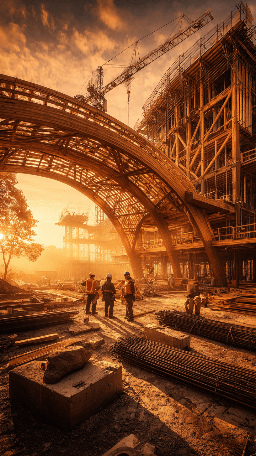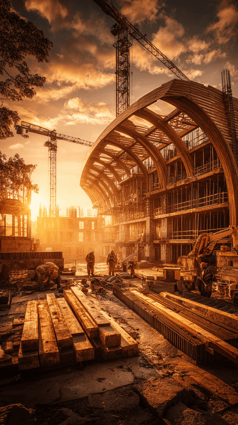 Timber Arc Works is a large-scale construction project commissioned by Ardentia Development Group, centered on the realization of a neo-vernacular organic modern structure. The building is defined by a sequence of curved engineered timber arches rising from a solid stone base, combining contemporary construction methods with traditional material expression. Scaffolding, prefabricated timber elements, and low-carbon structural systems shape a site that balances precision engineering with handcrafted assembly.